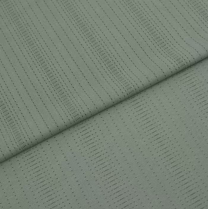 The fabric features a gradient needle – punched mesh structure. It feels smooth, has a certain elasticity due to the spandex content, and shows good drapability. Lightweight and breathable, it fits the body without causing stuffiness during sports. The texture is regular and delicate, with a fine and smooth touch.