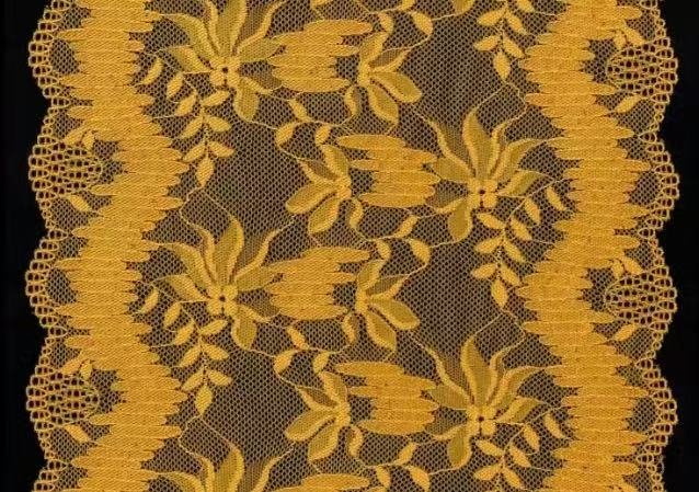 This lace is gorgeous and eye – catching. With a dark brown mesh base, vivid gold outlines elaborate and intricate floral patterns. The leaves have clear veins, and the flowers are full and lifelike, as if blooming quietly. The unique weaving design at the edge echoes the main flowers, being delicate and harmonious. Whether adorning the hem of a grand dress or adding charm to home decorations, it can create a luxurious and elegant atmosphere with this touch of noble gold and exquisite craftsmanship.