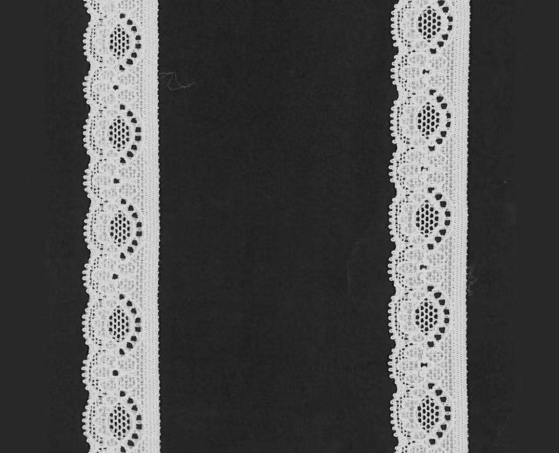 This is a white lace trim. It features simple geometric patterns, with units similar to ellipses and hollow – out details repeatedly arranged. The edges are wavy, and the workmanship is fine with a lightweight texture. It is suitable for decorating the edges of lingerie, children’s clothing, or embellishing small items like handkerchiefs and hair accessories, adding a delicate and sweet touch.